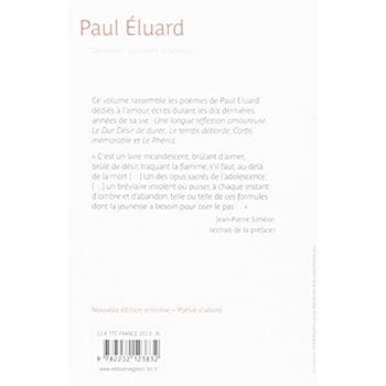 quel bonheur se de laisser porter par cette superbe sélection de textes...Un ouvrage qui se savoure et qui appelle de nombreuses relectures. oute la poésie d'Eluard est concentrée dans un choix remarquable des textes de cet auteur. La pureté de la langue, la concision de l'image, la finesse de mots ciselés avec sobriété font de ce recueil de poèmes un grand moment de bonheur. Un livre destiné à rester à portée de mains pour ouvrir à de nombreuses relectures. Que du bonheur....