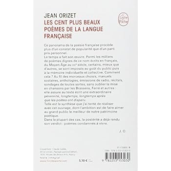 « Le titre de cette anthologie pourrait, à bon droit, sembler outrecuidant et sujet à caution s’il reflétait le seul choix, forcément arbitraire, d’un individu. Ce n’est pas le cas ici. Je me suis attaché, pour établir ce florilège, à privilégier les poèmes qui font, depuis longtemps, l’unanimité des lecteurs et amateurs de poésie.Sans écarter ma sensibilité propre, j’ai voulu la contenir autant qu’il est possible : ce panorama procède, encore une fois, plus d’un constat de popularité que d’un parti pris personnel. Le temps a fait son œuvre. Parmi les milliers de poèmes dignes de ce nom écrits en français, du Moyen Age au xxe siècle, certains, mieux que d’autres, se sont im-posés au goût du public puis à la mémoire individuelle et collective. Comment cela ? Au fil des morceaux choisis, manuels scolaires, anthologies, émissions de radio, récitals, sondages de toutes sortes, sans oublier la mise en chansons par les Brassens, Ferré et autres : elle assure au texte écrit une extraordinaire pérennité, longtemps, longtemps après que les poètes ont disparu.Telle est la synthèse que j’ai tenté de réaliser avec cet ouvrage, dont l’ambition est de faire aimer au grand public le meilleur de notre patrimoine poétique.Dans la plupart des cas, la postérité a déjà rendu son verdict : poèmes condamnés à vivre. »Jean Orizet
